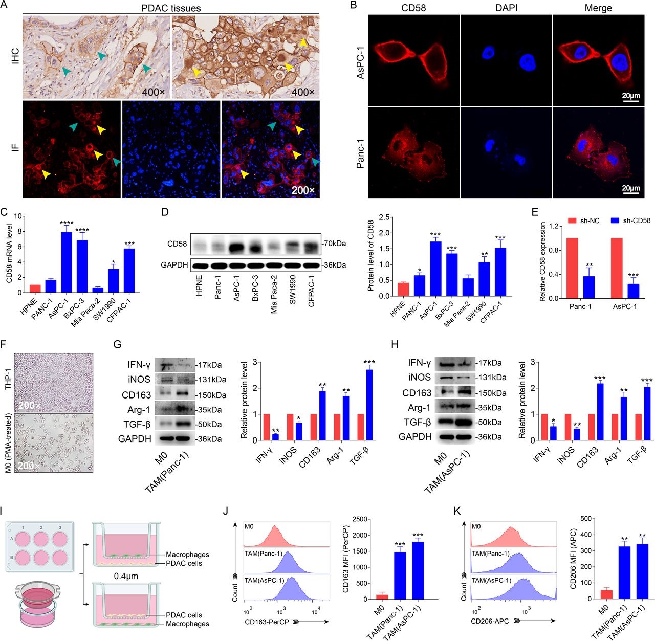 Pancreatic cancers are diffusely infiltrated with tumor-associated macrophages (TAMs) and are associated with a surprisingly high loss of heterozygosity of HLA class I alleles. Part of their biology is to produce TGF-β1, which promotes, through the Smad2/3 signaling pathway, so-called ‘separation’ of CD58 with diminished expression on the cancer cell surface and increased extracellular soluble CD58 (sCD58). Furthermore, thematic for this Digest, is their ability to promote the generation of regulatory T cells. Addition of sCD58 failed to induce M0 polarization to M2 type in naive macrophages. Forced overexpression of CD58 on pancreatic tumor cells promoted recognition and lysis by T and NK cells. In a murine model, overexpression of the CD58 murine homologue, CD48, limited tumor growth and local peritumoral injection of sCD48 restored tumor growth. Both increased T and NK cells were found in those animals overexpressing the CD58 homologue. Serum samples from patients demonstrated that levels of sCD58 and TGF-β1 in the serum of stage II but not stage I pancreatic ductal adenocarcinoma patients were higher than those of the healthy controls. Furthermore, the use of the conventional pancreatic cancer marker, CA19-9, which is useful or produced in only about 85% of advanced pancreatic cancer patients, when coupled with serum TGF-β1 and sCD58 measures, provided superior correlation with patient outcomes. One serious problem of the use of CA19-9 measures alone is that those who do not express the product have limited ability to be followed with treatment. The use of TGF-β1 and sCD58 in these patients provided good correlates with diminished survival when elevated.