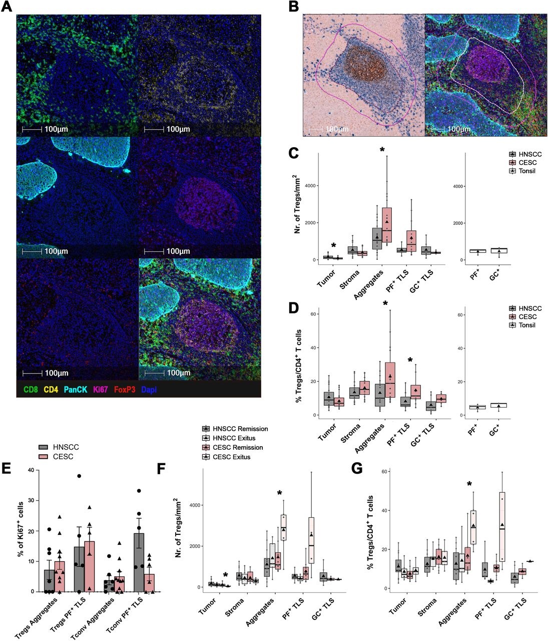 Tertiary lymphoid structures (TLS) when present in tumors are most frequently associated with improved prognosis. This has been clearly shown in patients with human papilloma virus (HPV)-associated head and neck cancer. This had not been investigated as thoroughly in cervical cancer (CESC), also even more strongly associated with HPV infection. Although the role of TLS in head and neck carcinoma was correlated with outcome in this Czech study as previously, it was not true in CESC. When further examining the three major groupings of TLS using Xenium transcriptome analysis (lymphoid aggregates, primary germinal center follicles, and mature TLS), they were unable to demonstrate improvements in survival within any group. Interestingly, the presence of both high Tregs and polymorphonuclear myeloid-derived suppressor cells (PMN-MDSC) within the TLS was associated with diminished expression of the TCRζ chain on CESC-infiltrating T cells. Increased expression of arginase 1 correlated with the decreased expression of this chain as well. TLS numbers in CESC were not correlated with improved survival. TLS were quite frequent in CESC but had surprisingly few GZMB + CD8 T cells, high numbers of Tregs and PMN-MDSCs. A T-cell exhaustion transcriptomic signature was associated with poor TLS maturation and few HPV-specific T cells.
