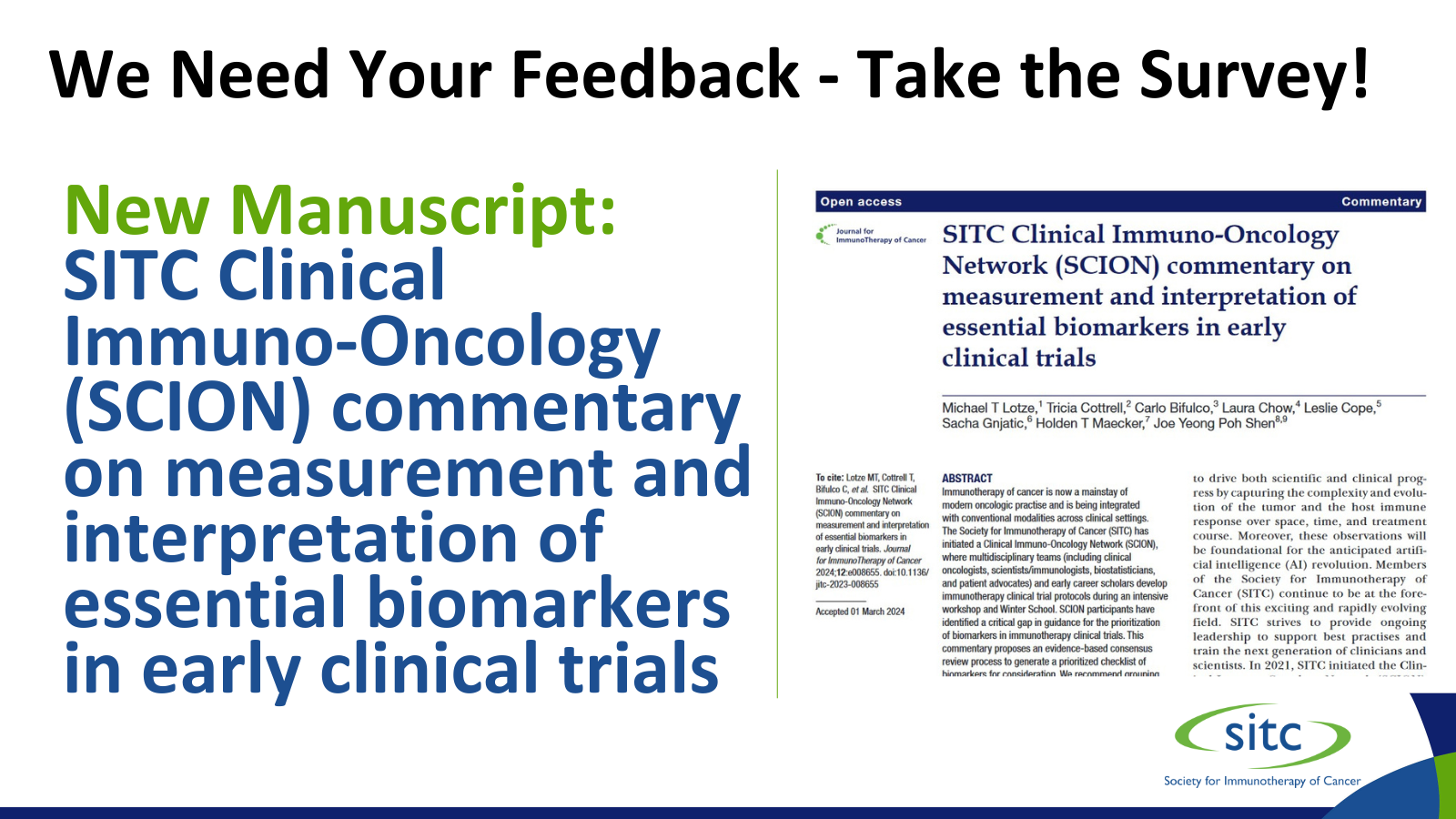 On behalf of the Society for Immunotherapy of Cancer (SITC), the SITC Biomarkers Committee, the SITC Pathology Committee, and the 2024 SITC Clinical Immuno-Oncology Network (SCION) faculty, we are pleased to announce the publication of a commentary on measurement and interpretation of essential biomarkers in early clinical trials.
