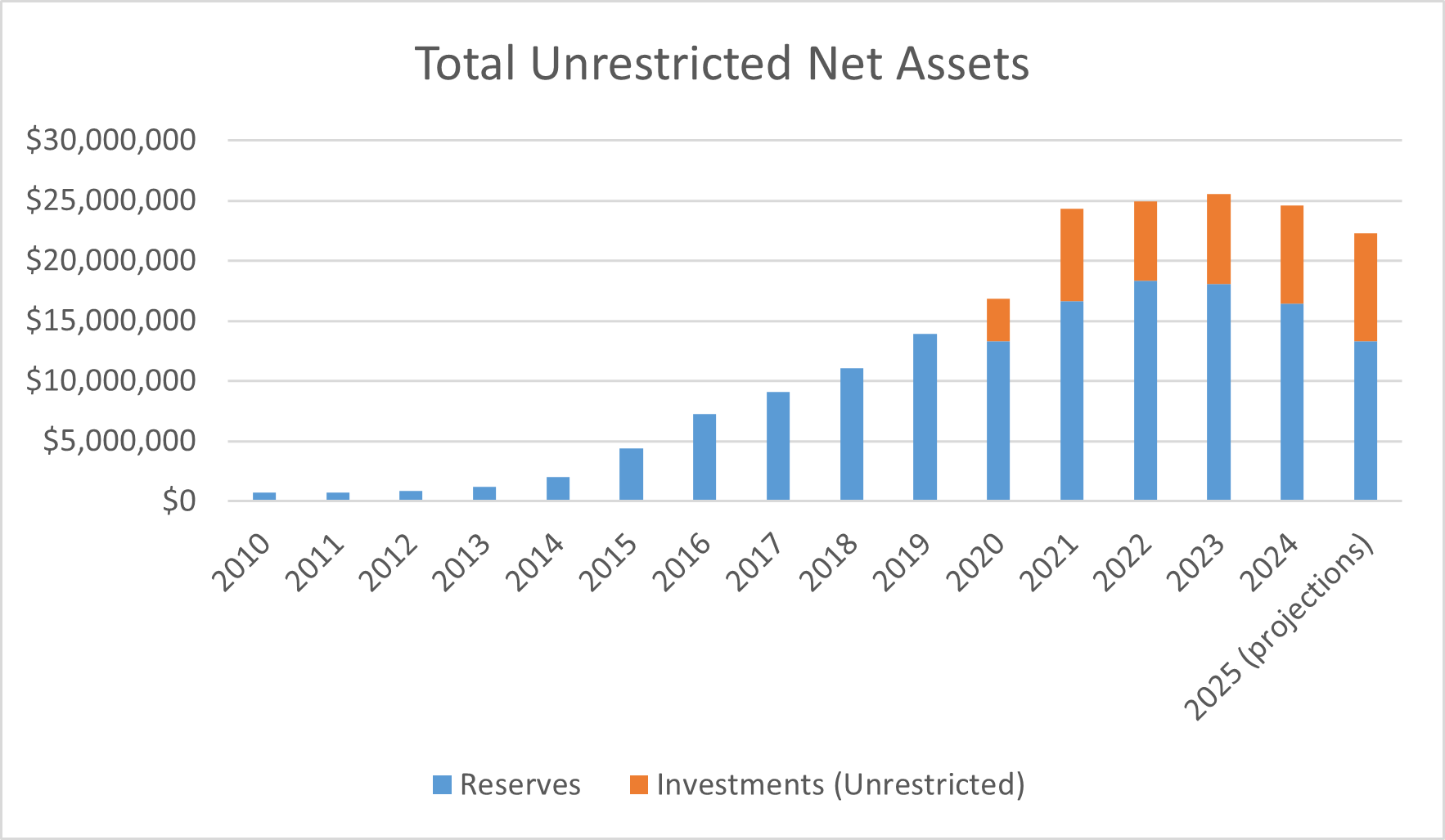 SITC remains financially strong, with more than $20M in unrestricted net assets, equivalent to nearly two year’s worth of operating expenses. In 2025, operating income totaled approximately $10.3M while operating expenses were $13.4M, resulting in an operating net loss of just over $3.1M. Investment income is projected to offset $900K of this loss.